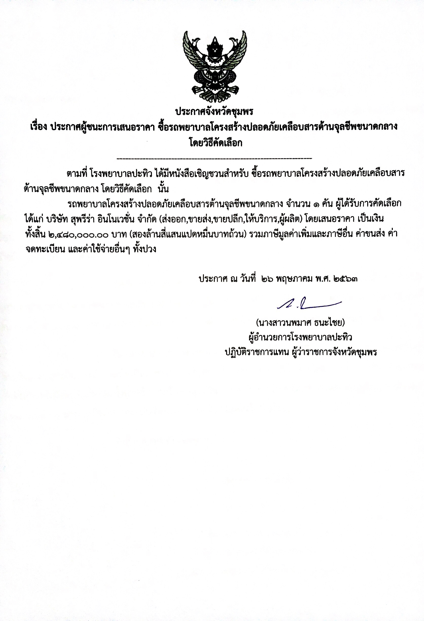 ประกาศผู้ชนะการจัดซื้อรถพยาบาลโครงสร้างปลอดภัยเคลือบสารต้านจุลชีพ ขนาดกลาง โรงพยาบาลปะทิว